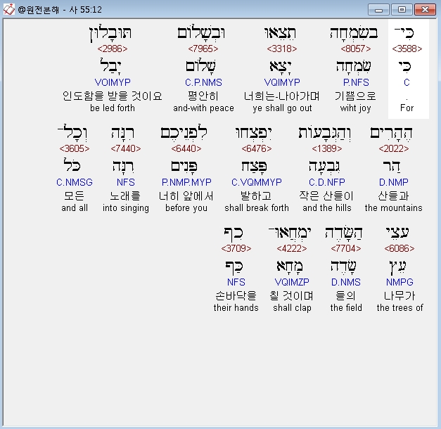 헬라어구약Septuagint,12 εν γαρ ευφροσυνη εξελευσεσθε και εν χαρα διδαχθησεσθε τα γαρ ορη και οι βουνοι εξαλουνται προσδεχομενοι υμας εν χαρα και παντα τα ξυλα του αγρου επικροτησει τοις κλαδοις