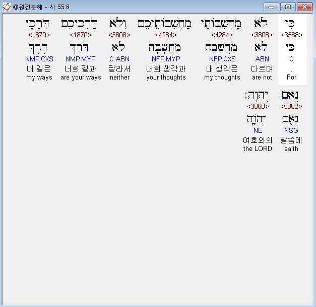 히브리어구약BHS,8 כִּי לֹא מַחְשְׁבֹותַי מַחְשְׁבֹותֵיכֶם וְלֹא דַרְכֵיכֶם דְּרָכָי נְאֻם יְהוָה׃