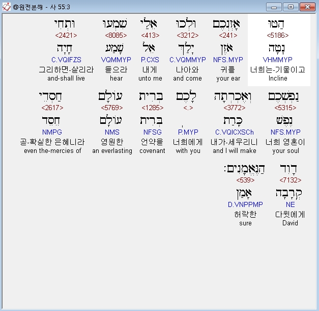 히브리어구약BHS,3 הַטּוּ אָזְנְכֶם וּלְכוּ אֵלַי שִׁמְעוּ וּתְחִי נַפְשְׁכֶם וְאֶכְרְתָה לָכֶם בְּרִית עֹולָם חַסְדֵי דָוִד הַנֶּאֱמָנִים׃