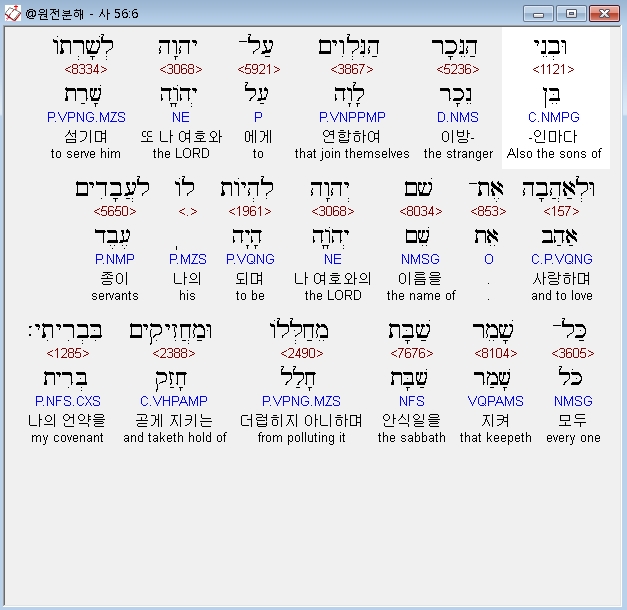 히브리어구약BHS,6 וּבְנֵי הַנֵּכָר הַנִּלְוִים עַל־יְהוָה לְשָׁרְתֹו וּלְאַהֲבָה אֶת־שֵׁם יְהוָה לִהְיֹות לֹו לַעֲבָדִים כָּל־שֹׁמֵר שַׁבָּת מֵחַלְּלֹו וּמַחֲזִיקִים בִּבְרִיתִי׃