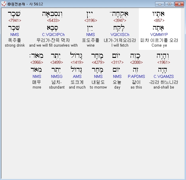 히브리어구약BHS,12 אֵתָיוּ אֶקְחָה־יַיִן וְנִסְבְּאָה שֵׁכָר וְהָיָה כָזֶה יֹום מָחָר גָּדֹול* יֶתֶר מְאֹד׃