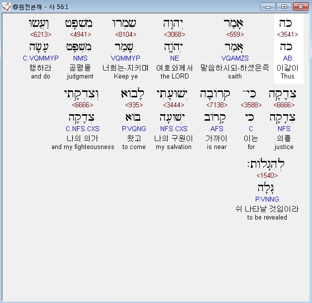 히브리어구약BHS,1 כֹּה אָמַר יְהוָה שִׁמְרוּ מִשְׁפָּט וַעֲשׂוּ צְדָקָה כִּי־קְרֹובָה יְשׁוּעָתִי לָבֹוא וְצִדְקָתִי לְהִגָּלֹות׃