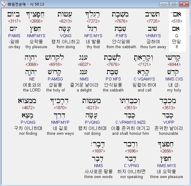 영어NASB,13 "If because of the sabbath, you turn your foot From doing your own pleasure on My holy day, And call the sabbath a delight, the holy day of the LORD honorable, And shall honor it, desisting from your own ways, From seeking your own pleasure, And speaking your own word,