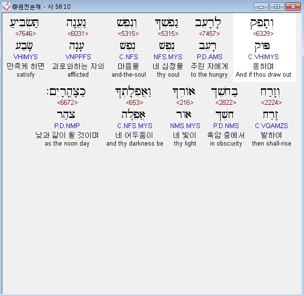 히브리어구약BHS,10 וְתָפֵק לָרָעֵב נַפְשֶׁךָ וְנֶפֶשׁ נַעֲנָה תַּשְׂבִּיעַ וְזָרַח בַּחֹשֶׁךְ אֹורֶךָ וַאֲפֵלָתְךָ כַּצָּהֳרָיִם׃