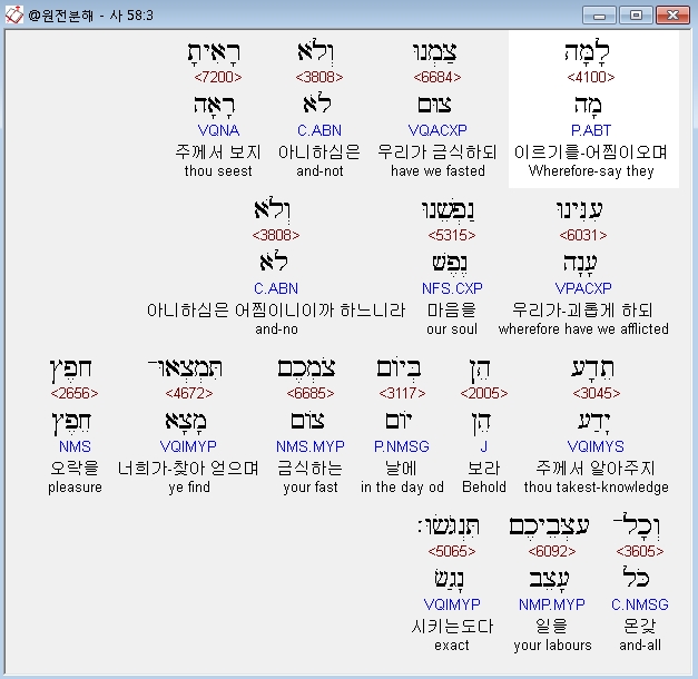 히브리어구약BHS,3 לָמָּה צַּמְנוּ וְלֹא רָאִיתָ עִנִּינוּ נַפְשֵׁנוּ וְלֹא תֵדָע הֵן בְּיֹום צֹםְכֶם תִּמְצְאוּ־חֵפֶץ וְכָל־עַצְּבֵיכֶם תִּנְגֹּשׂוּ׃