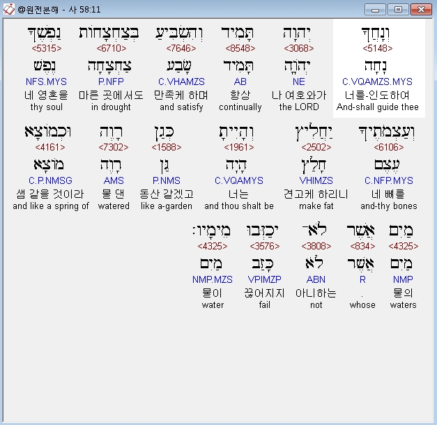 히브리어구약BHS,11 וְנָחֲךָ יְהוָה תָּמִיד וְהִשְׂבִּיעַ בְּצַחְצָחֹות נַפְשֶׁךָ וְעַצְמֹתֶיךָ יַחֲלִיץ וְהָיִיתָ כְּגַן רָוֶה וּכְמֹוצָא מַיִם אֲשֶׁר לֹא־יְכַזְּבוּ מֵימָיו׃