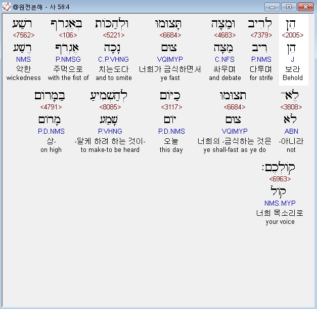 다투며 싸우며 - 물론 이스라엘 백성이 다투고 싸우는 것을 금식의 목적으로 삼고 있지는 않았을 것이다. 그러나 금식하는 중에조차 그러한 이욕(利慾)적인 혈기를 부릴 정도로, 그들은 금식의 목적 자체에 대해 무지하였음을 보여준다(Whybray).
