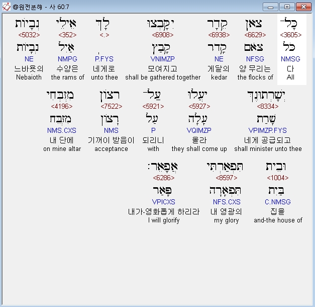 영어NASB,7 "All the flocks of Kedar will be gathered together to you, The rams of Nebaioth will minister to you; They will go up with acceptance on My altar, And I shall glorify My glorious house.