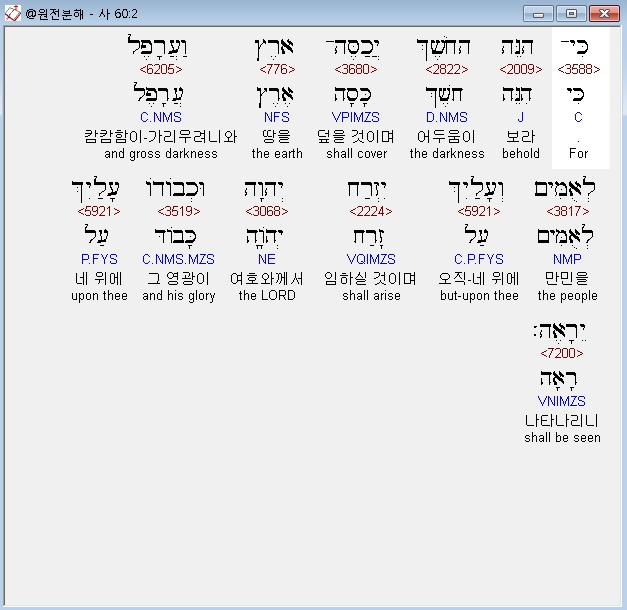 히브리어구약BHS,2 כִּי־הִנֵּה הַחֹשֶׁךְ יְכַסֶּה־אֶרֶץ וַעֲרָפֶל לְאֻמִּים וְעָלַיִךְ יִזְרַח יְהוָה וּכְבֹודֹו עָלַיִךְ יֵרָאֶה׃