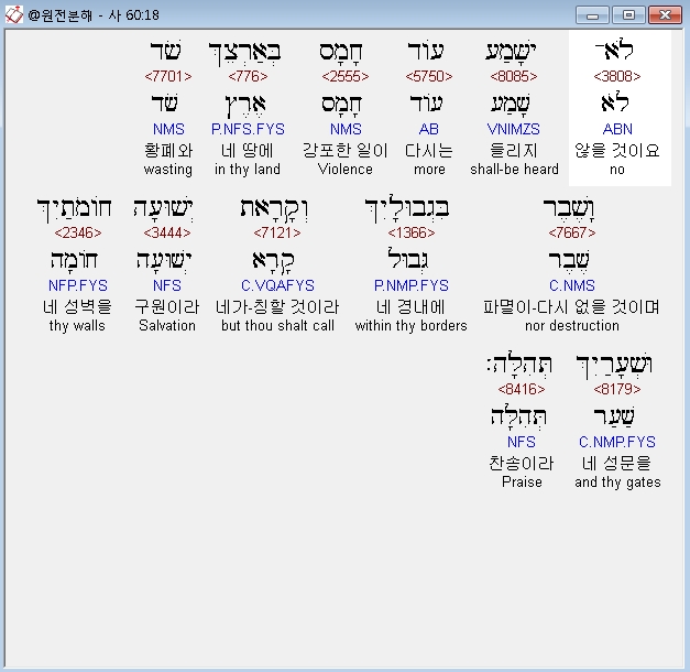 히브리어구약BHS,18 לֹא־יִשָּׁמַע עֹוד חָמָס בְּאַרְצֵךְ שֹׁד וָשֶׁבֶר בִּגְבוּלָיִךְ וְקָרָאת יְשׁוּעָה חֹומֹתַיִךְ וּשְׁעָרַיִךְ תְּהִלָּה׃