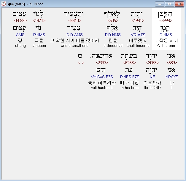히브리어구약BHS,22 הַקָּטֹן יִהְיֶה לָאֶלֶף וְהַצָּעִיר לְגֹוי עָצוּם אֲנִי יְהוָה בְּעִתָּהּ אֲחִישֶׁנָּה׃ ס