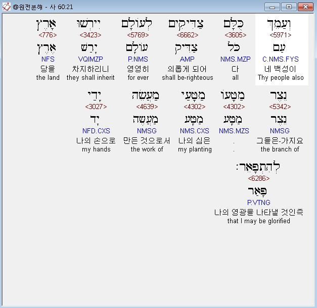 개역개정,21 네 백성이 다 의롭게 되어 영원히 땅을 차지하리니 그들은 내가 심은 가지요 내가 손으로 만든 것으로서 나의 영광을 나타낼 것인즉