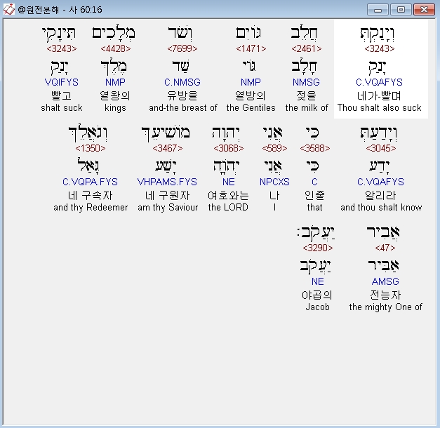 영어NRSV,16 You shall suck the milk of nations, you shall suck the breasts of kings; and you shall know that I, the LORD, am your Savior and your Redeemer, the Mighty One of Jacob.