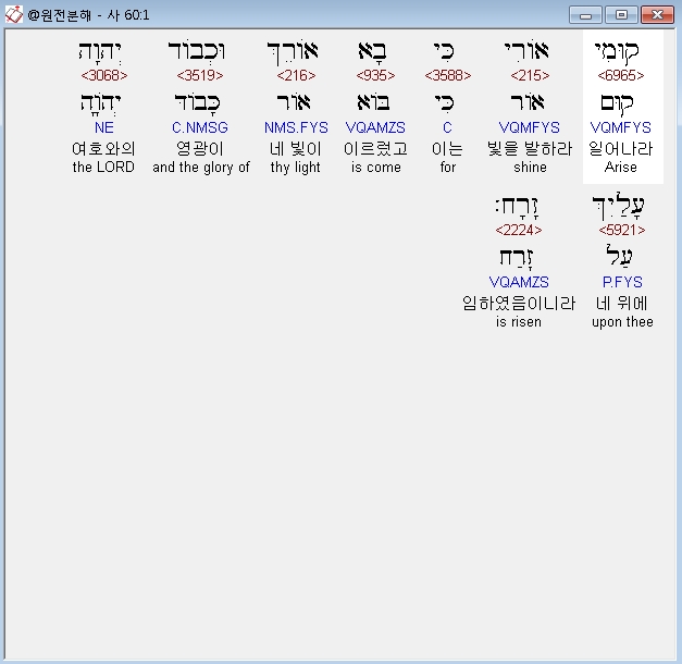 히브리어구약BHS,1 קוּמִי אֹורִי כִּי בָא אֹורֵךְ וּכְבֹוד יְהוָה עָלַיִךְ זָרָח׃