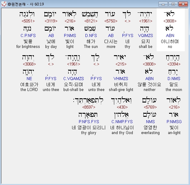 히브리어구약BHS,19 לֹא־יִהְיֶה־לָּךְ עֹוד הַשֶּׁמֶשׁ לְאֹור יֹוםָם וּלְנֹגַהּ הַיָּרֵחַ לֹא־יָאִיר לָךְ וְהָיָה־לָךְ יְהוָה לְאֹור עֹולָם וֵאלֹהַיִךְ לְתִפְאַרְתֵּךְ׃