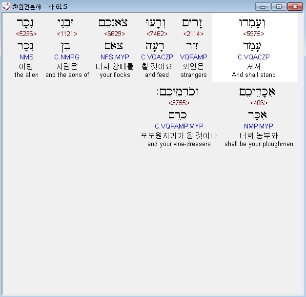 히브리어구약BHS,5 וְעָמְדוּ זָרִים וְרָעוּ צֹאנְכֶם וּבְנֵי נֵכָר אִכָּרֵיכֶם וְכֹרְמֵיכֶם׃