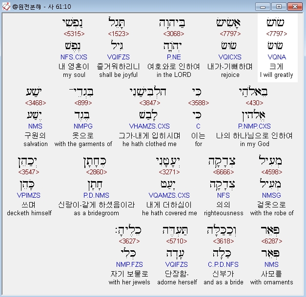 헬라어구약Septuagint,10 και ευφροσυνη ευφρανθησονται επι κυριον αγαλλιασθω η ψυχη μου επι τω κυριω ενεδυσεν γαρ με ιματιον σωτηριου και χιτωνα ευφροσυνης ως νυμφιω περιεθηκεν μοι μιτραν και ως νυμφην κατεκοσμησεν με κοσμω