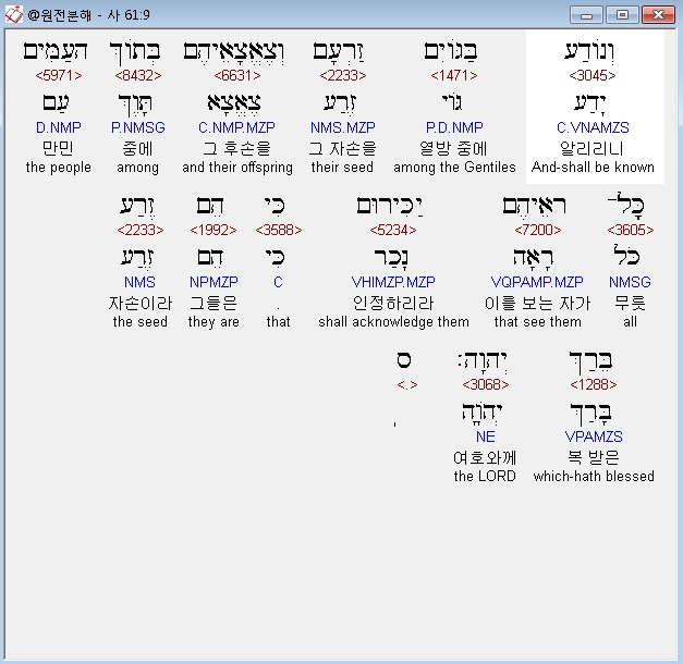 히브리어구약BHS,9 וְנֹודַע בַּגֹּויִם זַרְעָם וְצֶאֱצָאֵיהֶם בְּתֹוךְ הָעַמִּים כָּל־רֹאֵיהֶם יַכִּירוּם כִּי הֵם זֶרַע בֵּרַךְ יְהוָה׃ ס