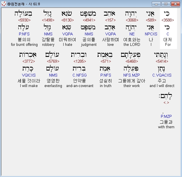 히브리어구약BHS,8 כִּי אֲנִי יְהוָה אֹהֵב מִשְׁפָּט שֹׂנֵא גָזֵל בְּעֹולָה וְנָתַתִּי פְעֻלָּתָם בֶּאֱמֶת וּבְרִית עֹולָם אֶכְרֹות לָהֶם׃
