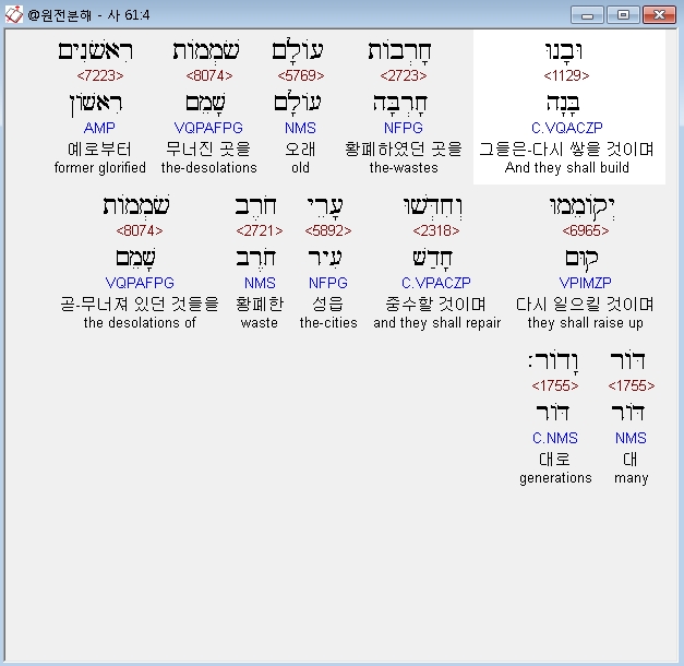 히브리어구약BHS,4 וּבָנוּ חָרְבֹות עֹולָם שֹׁמְמֹות רִאשֹׁנִים יְקֹומֵמוּ וְחִדְּשׁוּ עָרֵי חֹרֶב שֹׁמְמֹות דֹּור וָדֹור׃
