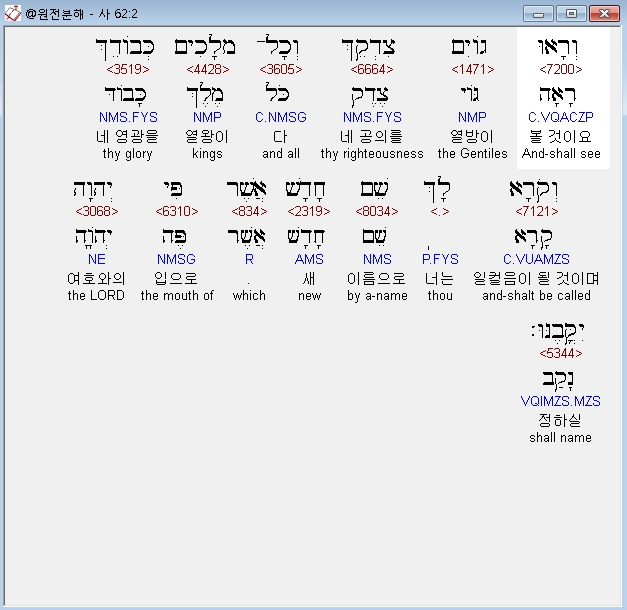 히브리어구약BHS,2 וְרָאוּ גֹויִם צִדְקֵךְ וְכָל־מְלָכִים כְּבֹודֵךְ וְקֹרָא לָךְ שֵׁם חָדָשׁ אֲשֶׁר פִּי יְהוָה יִקֳּבֶנּוּ׃