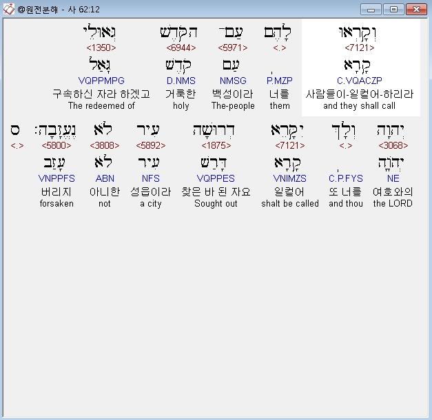 히브리어구약BHS,12 וְקָרְאוּ לָהֶם עַם־הַקֹּדֶשׁ גְּאוּלֵי יְהוָה וְלָךְ יִקָּרֵא דְרוּשָׁה עִיר לֹא נֶעֱזָבָה׃ ס