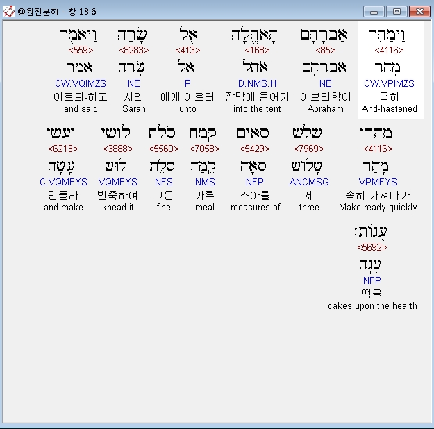 히브리어구약BHS,6 וַיְמַהֵר אַבְרָהָם הָאֹהֱלָה אֶל־שָׂרָה וַיֹּאמֶר מַהֲרִי שְׁלֹשׁ סְאִים קֶמַח סֹלֶת לוּשִׁי וַעֲשִׂי עֻגֹות׃