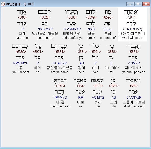 영어NASB,5 and I will bring a piece of bread, that you may refresh yourselves; after that you may go on, since you have visited your servant. "And they said," So do, as you have said. "
