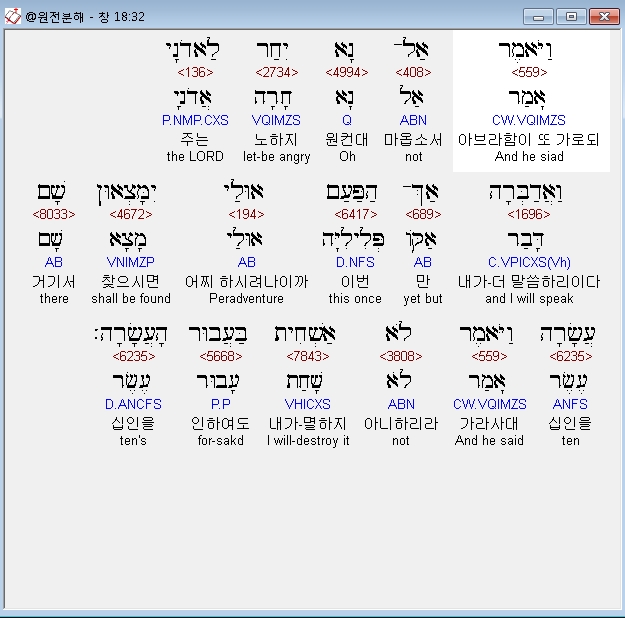 히브리어구약BHS,32 וַיֹּאמֶר אַל־נָא יִחַר לַאדֹנָי וַאֲדַבְּרָה אַךְ־הַפַּעַם אוּלַי יִמָּצְאוּן שָׁם עֲשָׂרָה וַיֹּאמֶר לֹא אַשְׁחִית בַּעֲבוּר הָעֲשָׂרָה׃
