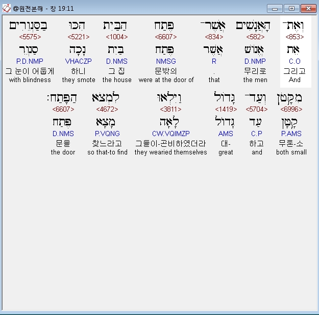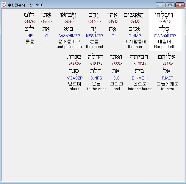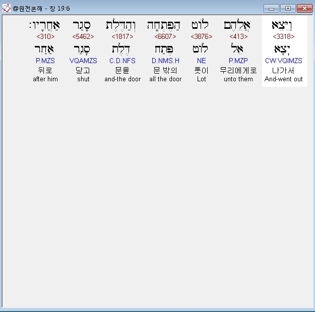 히브리어구약BHS,6 וַיֵּצֵא אֲלֵהֶם לֹוט הַפֶּתְחָה וְהַדֶּלֶת סָגַר אַחֲרָיו׃