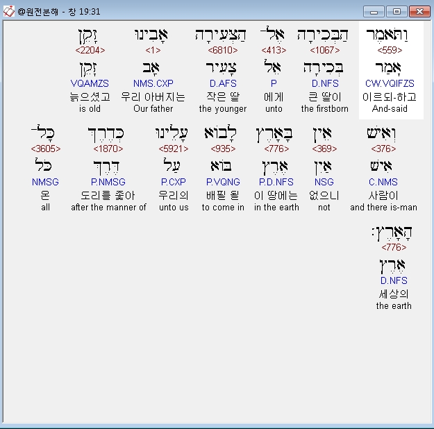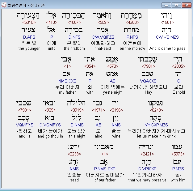 영어NASB,34 And it came about on the morrow, that the first-born said to the younger, "Behold, I lay last night with my father; let us make him drink wine tonight also; then you go in and lie with him, that we may preserve our family through our father."
