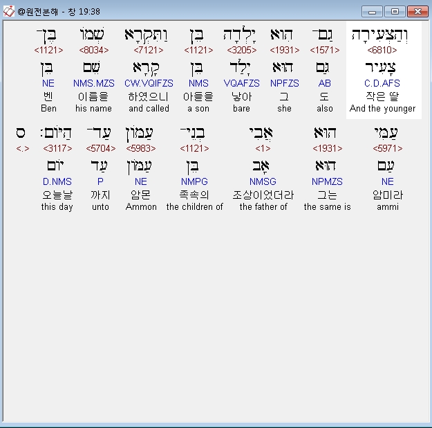 히브리어구약BHS,38 וְהַצְּעִירָה גַם־הִוא יָלְדָה בֵּן וַתִּקְרָא שְׁמֹו בֶּן־עַמִּי הוּא אֲבִי בְנֵי־עַמֹּון עַד־הַיֹּום׃ ס