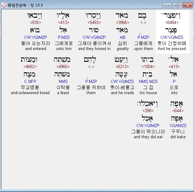 히브리어구약BHS,3 וַיִּפְצַר־בָּם מְאֹד וַיָּסֻרוּ אֵלָיו וַיָּבֹאוּ אֶל־בֵּיתֹו וַיַּעַשׂ לָהֶם מִשְׁתֶּה וּמַצֹּות אָפָה וַיֹּאכֵלוּ׃