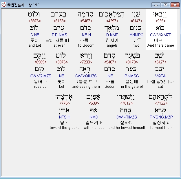 히브리어구약BHS,1 וַיָּבֹאוּ שְׁנֵי הַמַּלְאָכִים סְדֹמָה בָּעֶרֶב וְלֹוט יֹשֵׁב בְּשַׁעַר־סְדֹם וַיַּרְא־לֹוט וַיָּקָם לִקְרָאתָם וַיִּשְׁתַּחוּ אַפַּיִם אָרְצָה׃