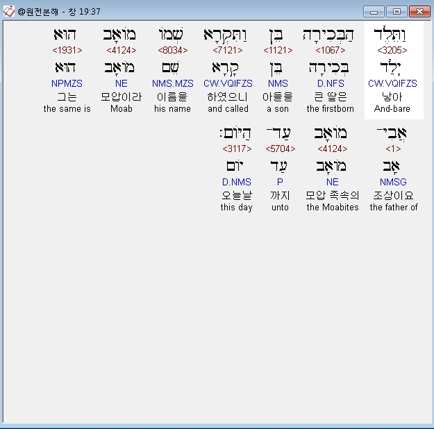 히브리어구약BHS,37 וַתֵּלֶד הַבְּכִירָה בֵּן וַתִּקְרָא שְׁמֹו מֹואָב הוּא אֲבִי־מֹואָב עַד־הַיֹּום׃
