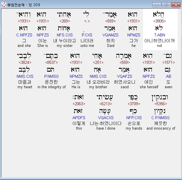 히브리어구약BHS,5 הֲלֹא הוּא אָמַר־לִי אֲחֹתִי הִוא וְהִיא־גַם־הִוא אָמְרָה אָחִי הוּא בְּתָם־לְבָבִי וּבְנִקְיֹן כַּפַּי עָשִׂיתִי זֹאת׃