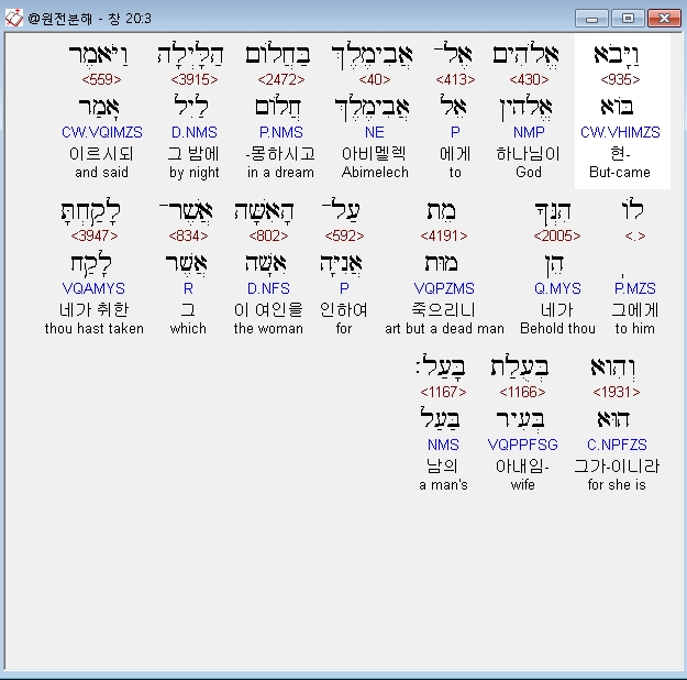 와야보 엘로힘 엘 아비멜렠 바할롬 하라일라 와요멜 로 힌네카 메트 알 하잇솨 아쉘 라카흐타 웨히우 베울라트 바알