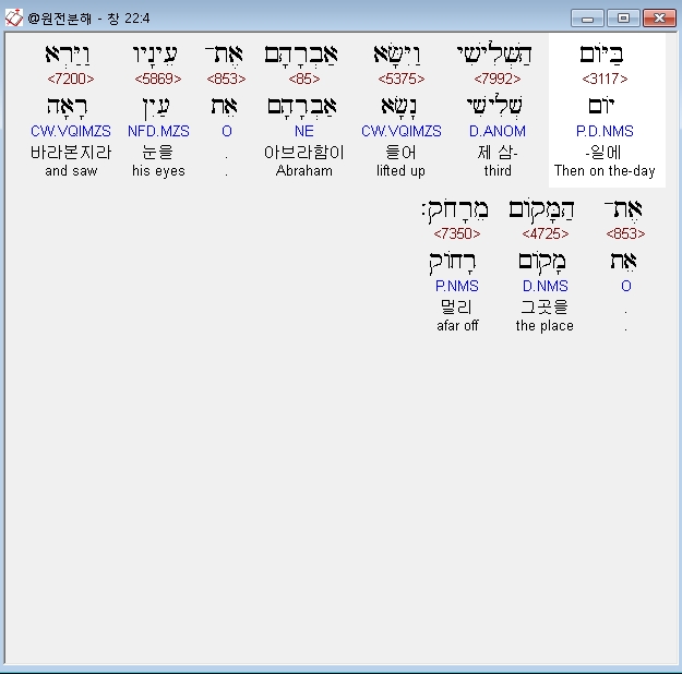 히브리어구약BHS,4 בַּיֹּום הַשְּׁלִישִׁי וַיִּשָּׂא אַבְרָהָם אֶת־עֵינָיו וַיַּרְא אֶת־הַמָּקֹום מֵרָחֹק׃