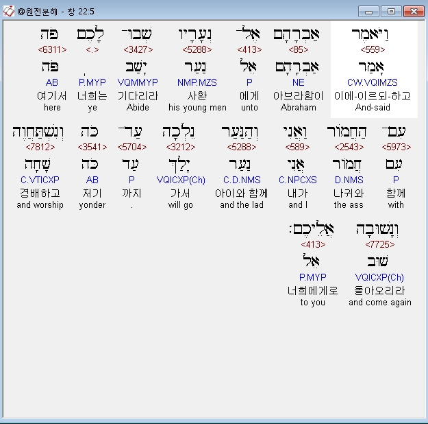 히브리어구약BHS,5 וַיֹּאמֶר אַבְרָהָם אֶל־נְעָרָיו שְׁבוּ־לָכֶם פֹּה עִם־הַחֲמֹור וַאֲנִי וְהַנַּעַר נֵלְכָה עַד־כֹּה וְנִשְׁתַּחֲוֶה וְנָשׁוּבָה אֲלֵיכֶם׃