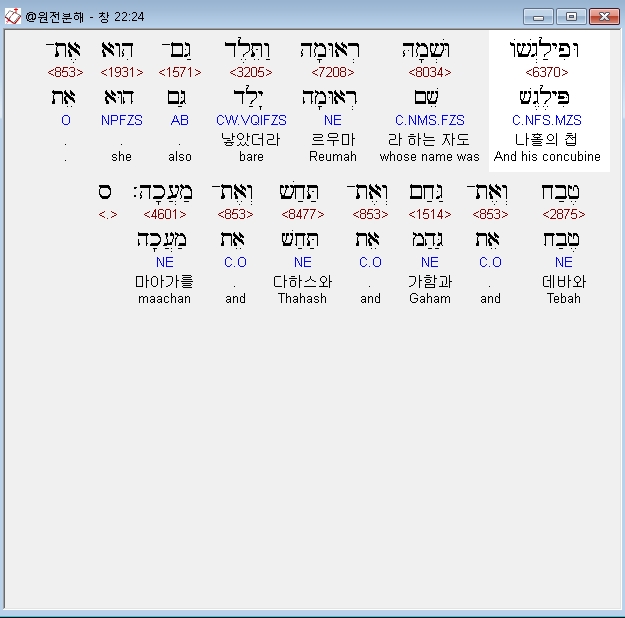 영어NASB,24 And his concubine, whose name was Reumah, also bore Tebah and Gaham and Tahash and Maacah.