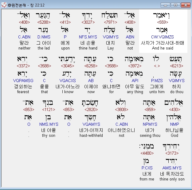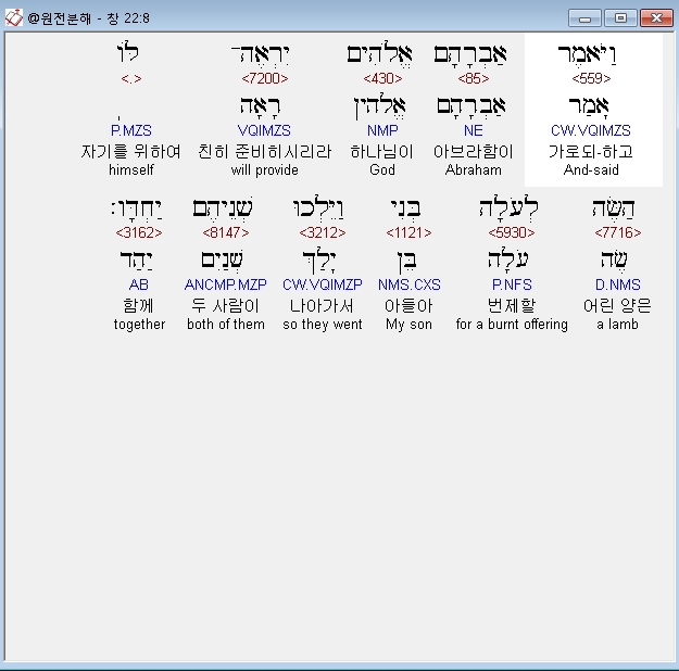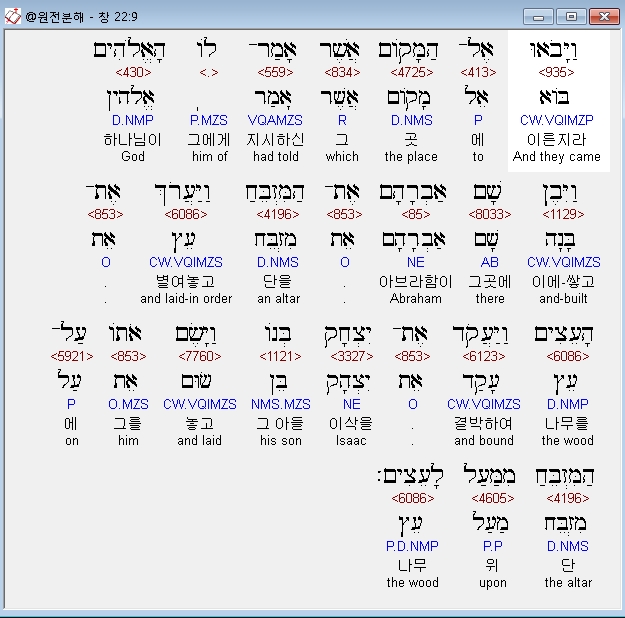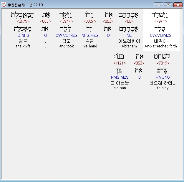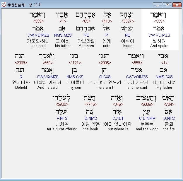 영어NASB,6 And Abraham took the wood of the burnt offering and laid it on Isaac his son, and he took in his hand the fire and the knife. So the two of them walked on together.