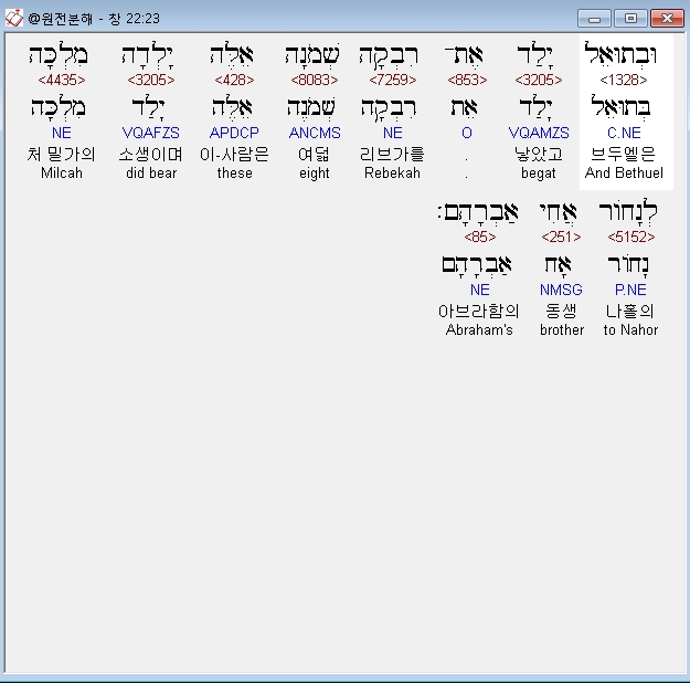 히브리어구약BHS,23 וּבְתוּאֵל יָלַד אֶת־רִבְקָה שְׁמֹנָה אֵלֶּה יָלְדָה מִלְכָּה לְנָחֹור אֲחִי אַבְרָהָם׃
