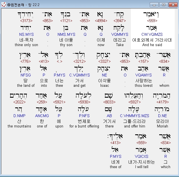 히브리어구약BHS,2 וַיֹּאמֶר קַח־נָא אֶת־בִּנְךָ אֶת־יְחִידְךָ אֲשֶׁר־אָהַבְתָּ אֶת־יִצְחָק וְלֶךְ־לְךָ אֶל־אֶרֶץ הַמֹּרִיָּה וְהַעֲלֵהוּ שָׁם לְעֹלָה עַל אַחַד הֶהָרִים אֲשֶׁר אֹמַר אֵלֶיךָ׃