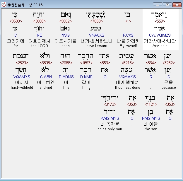 나의 말을 준행하였음이니라 - 육신의 번민과 애정을 극복하고 하나님을 경외한 아브라함의 믿음의 순종을 하나님께서 인정해 주시는 장면이다. 이러한 인정은 누구든지 악에 물들지 아니하며 믿음의 길을 달려간 자이면 다 받을 것인데 하나님께서는 그러한 자들을 자신의 영광의 자리에로 초대해 주실 것이다(마 25:21).