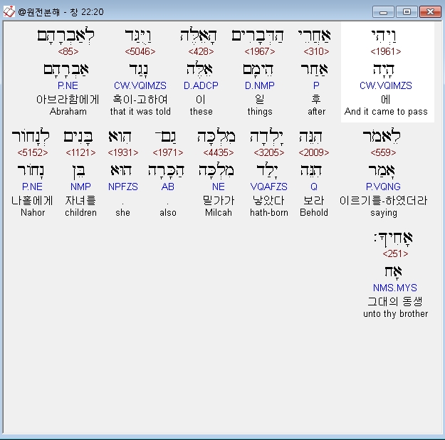 히브리어구약BHS,20 וַיְהִי אַחֲרֵי הַדְּבָרִים הָאֵלֶּה וַיֻּגַּד לְאַבְרָהָם לֵאמֹר הִנֵּה יָלְדָה מִלְכָּה גַם־הִוא בָּנִים לְנָחֹור אָחִיךָ׃