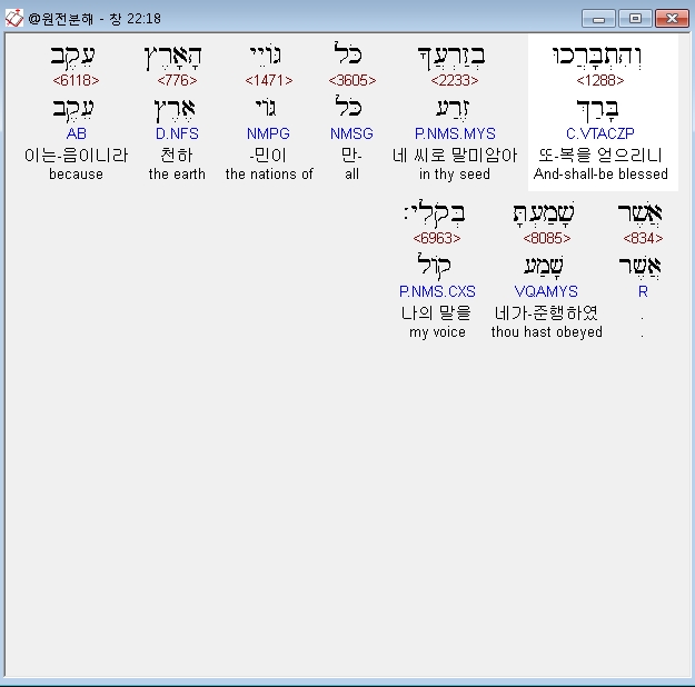 히브리어구약BHS,18 וְהִתְבָּרֲכוּ בְזַרְעֲךָ כֹּל גֹּויֵי הָאָרֶץ עֵקֶב אֲשֶׁר שָׁמַעְתָּ בְּקֹלִי׃