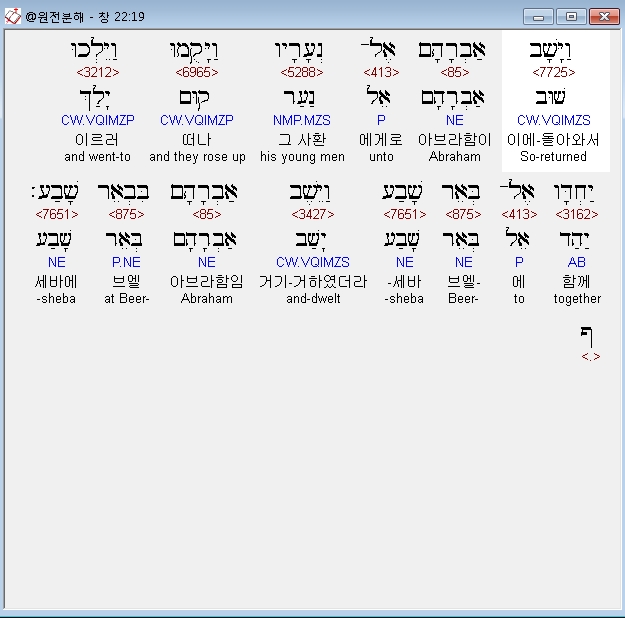 히브리어구약BHS,19 וַיָּשָׁב אַבְרָהָם אֶל־נְעָרָיו וַיָּקֻמוּ וַיֵּלְכוּ יַחְדָּו אֶל־בְּאֵר שָׁבַע וַיֵּשֶׁב אַבְרָהָם בִּבְאֵר שָׁבַע׃ ף