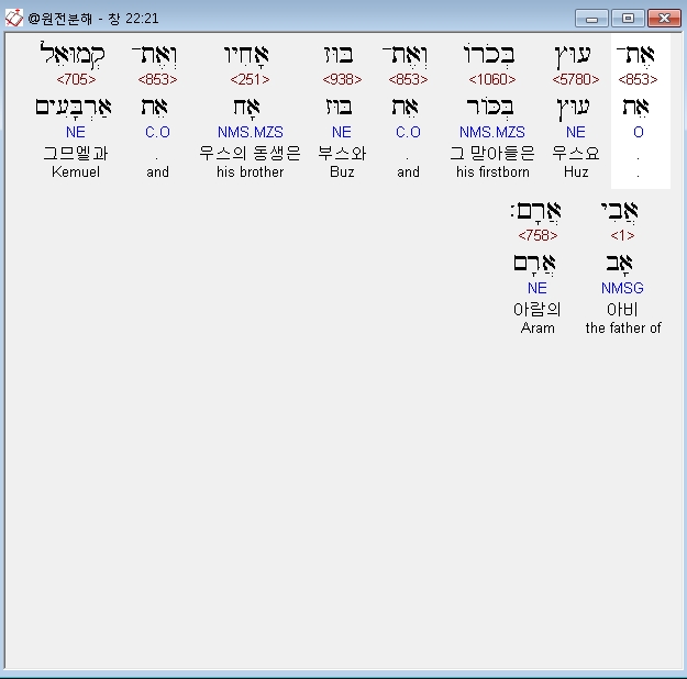 히브리어구약BHS,21 אֶת־עוּץ בְּכֹרֹו וְאֶת־בּוּז אָחִיו וְאֶת־קְמוּאֵל אֲבִי אֲרָם׃