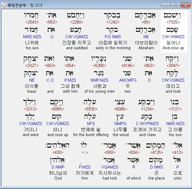 히브리어구약BHS,3 וַיַּשְׁכֵּם אַבְרָהָם בַּבֹּקֶר וַיַּחֲבֹשׁ אֶת־חֲמֹרֹו וַיִּקַּח אֶת־שְׁנֵי נְעָרָיו אִתֹּו וְאֵת יִצְחָק בְּנֹו וַיְבַקַּע עֲצֵי עֹלָה וַיָּקָם וַיֵּלֶךְ אֶל־הַמָּקֹום אֲשֶׁר־אָמַר־לֹו הָאֱלֹהִים׃